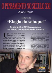 Nesta segunda, 14/6, às 18h30, no auditório da Reitoria da UFSC, o escritor argentino Alan Pauls (autor de O passado, levado ao cinema por Hector Babenco) profere a conferência Elogio do sotaque. Este vai ser o quarto encontro do ciclo O Pensamento do Século XXI deste ano, que já trouxe o italiano Emanuele Coccia, a francesa Liliane Meffre e o norte-americano Christopher Dunn para debater questões emergentes da arte e do pensamento de vanguarda contemporâneos, informa a Agência de Comunicação da UFSC: “Ganhador do conceituado prêmio Herralde, de literatura em língua espanhola, com ´O passado`, Pauls tem também ´História do Pranto` traduzido no Brasil (pela Cosac Naify, em 2008) e uma obra breve, porém muito aclamada pela crítica internacional, com 11 títulos, vários deles traduzidos para o inglês, francês, alemão e outros idiomas”.